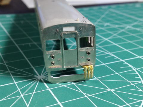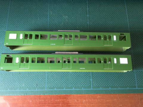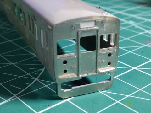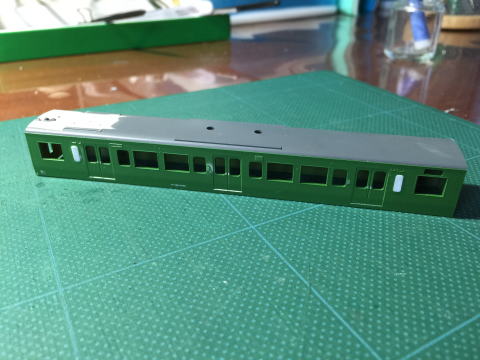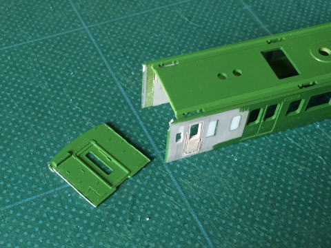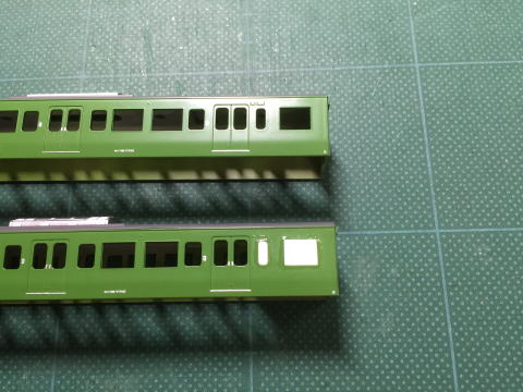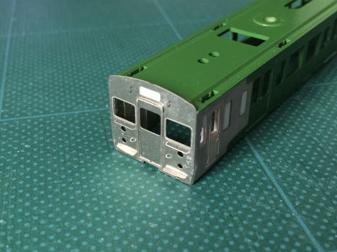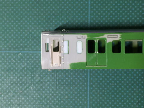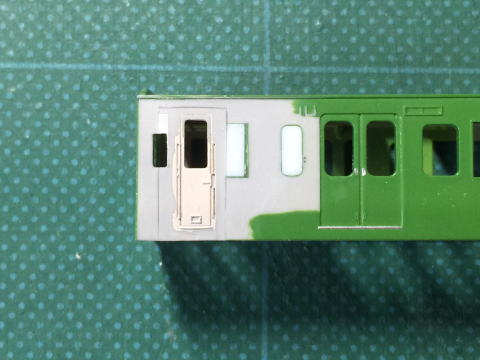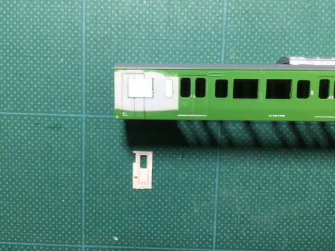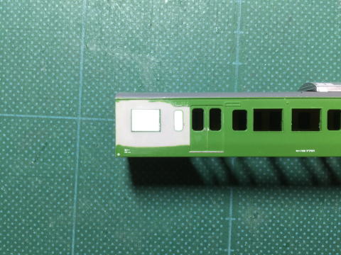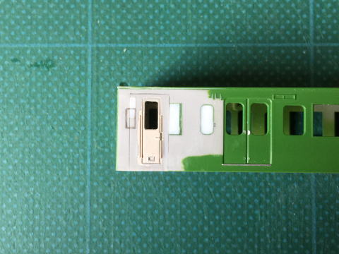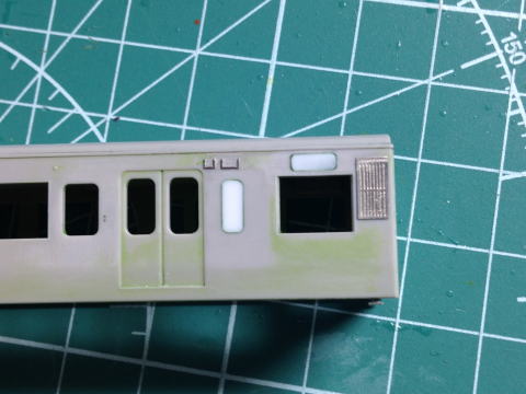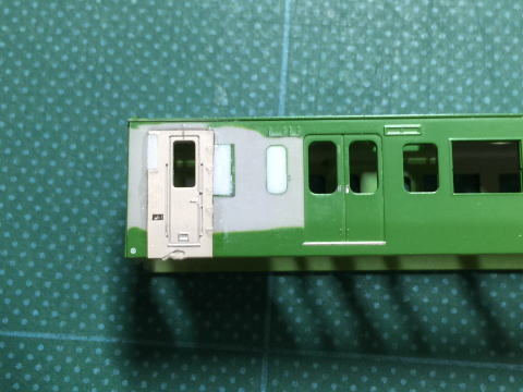 モハ114の窓埋め。 ドアボタンはヤスリがけをしやすくするため削ってしまい、塗装後インレタを貼り付けます。  |