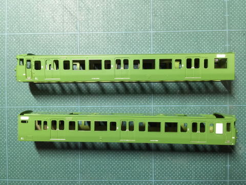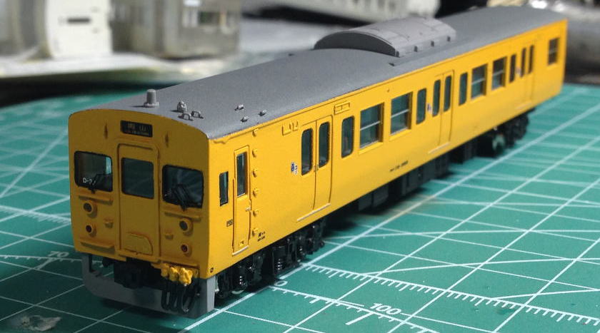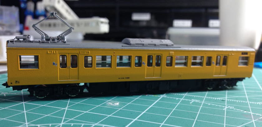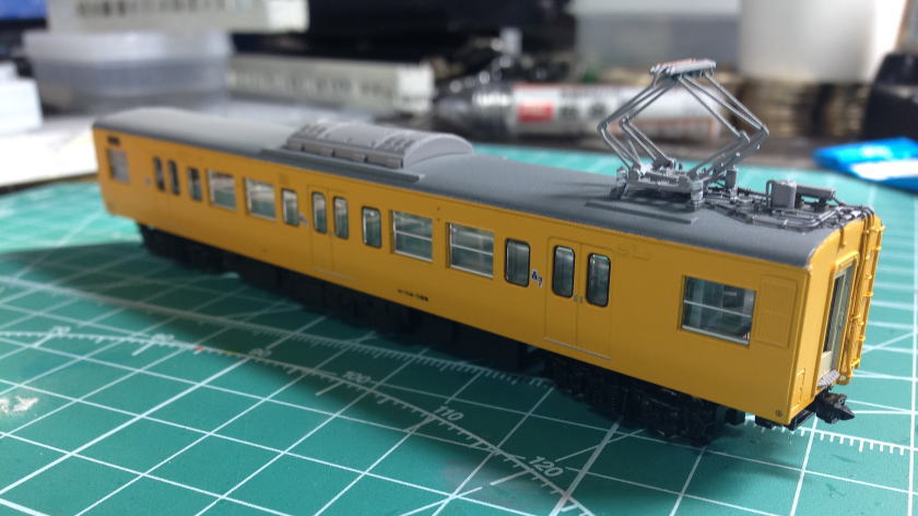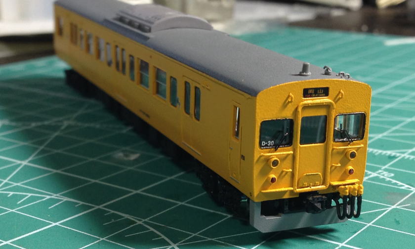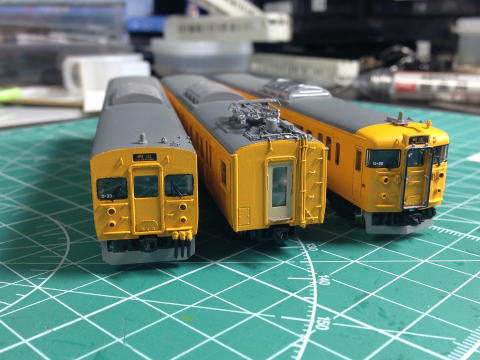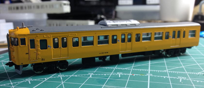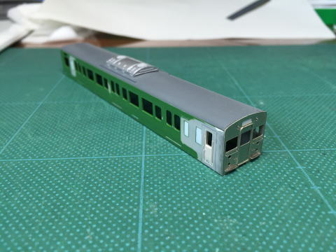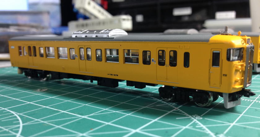 単色最高(全国単色化推進委員会会長) 更新色好きな方ごめんなさい。 屋根はダークグレーにつや消しを軽く。 窓ガラス埋めた部分はカットし、軽くゴム系接着剤で取り付けています。 動力はトミーFWのものに交換。 全車TNカプラー取り付け。 クハ115のスカートもトミーに交換しています。  |