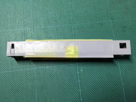 車体を洗浄後、ミッチャクロンマルチ (ミッチャクロンマルチGM完成品のプラには使用可キットなどのABS系プラ使用不可) ねずみ1号を塗装し、スカート部分をマスキング。 貫通扉にクリーム4号を塗り、マスキング後きいなく塗装します。 Mr113黄3:1黄カン色  |
