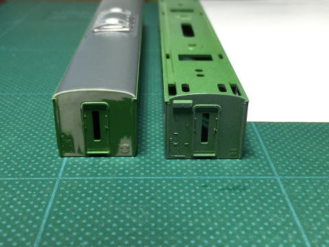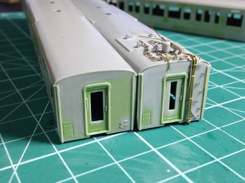 115系1000番台化するので、妻面のダクト手すりは削っておきます。 楕円銘板取付 バルディローズ801  |
