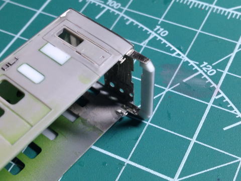 手すりステップを取り付け。 前面行先はプラ板を貼っておきます。  |