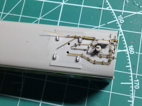 側面昇降ステップ タヴァサ445 クレーンフック タヴァサ456 屋上ひげ付き手すり バルディローズ 803 雨どいをプラ板で形状変更 ヤスリがけで削れてしまった部分のサボをバルディローズ217で取付。  |